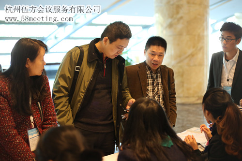會議現(xiàn)場簽到,參會人員正在辦理登記,領(lǐng)取資料證件。簽到處,也有參會人員咨詢接待人員。